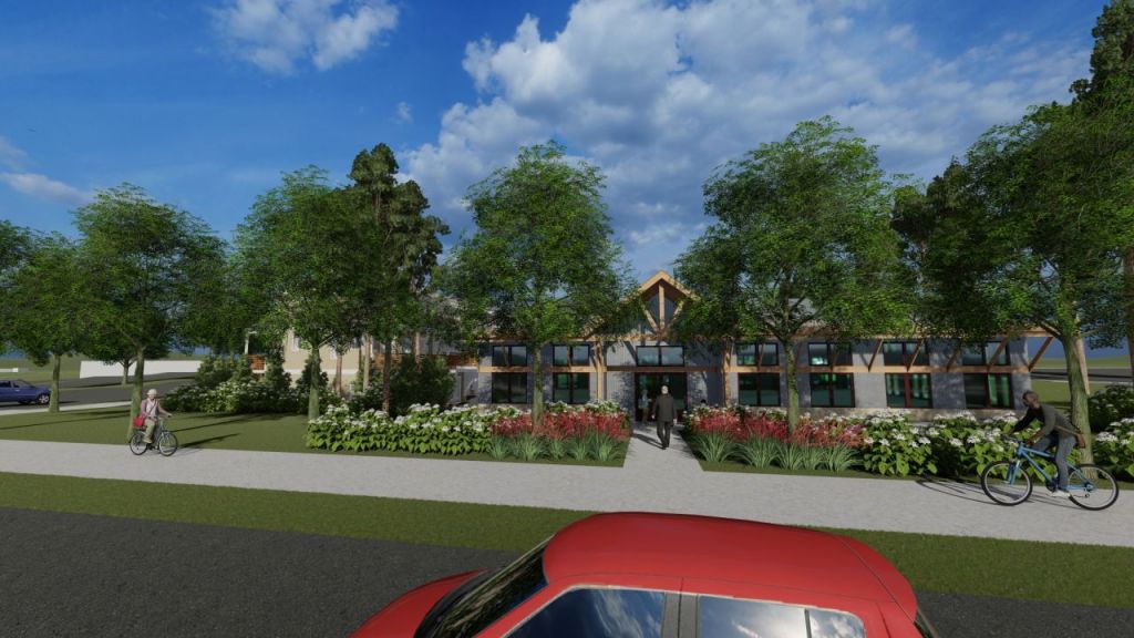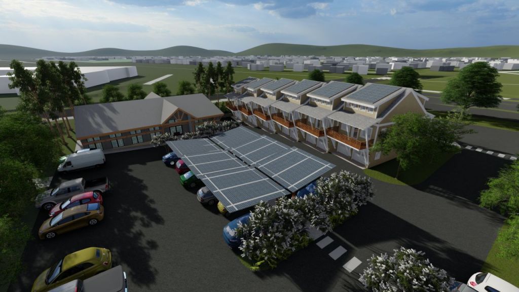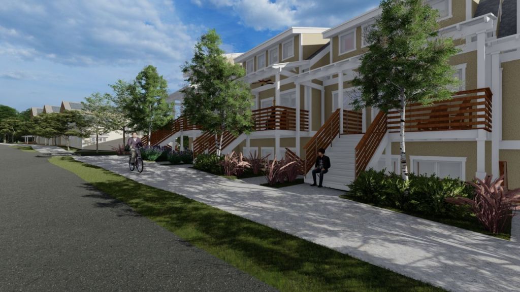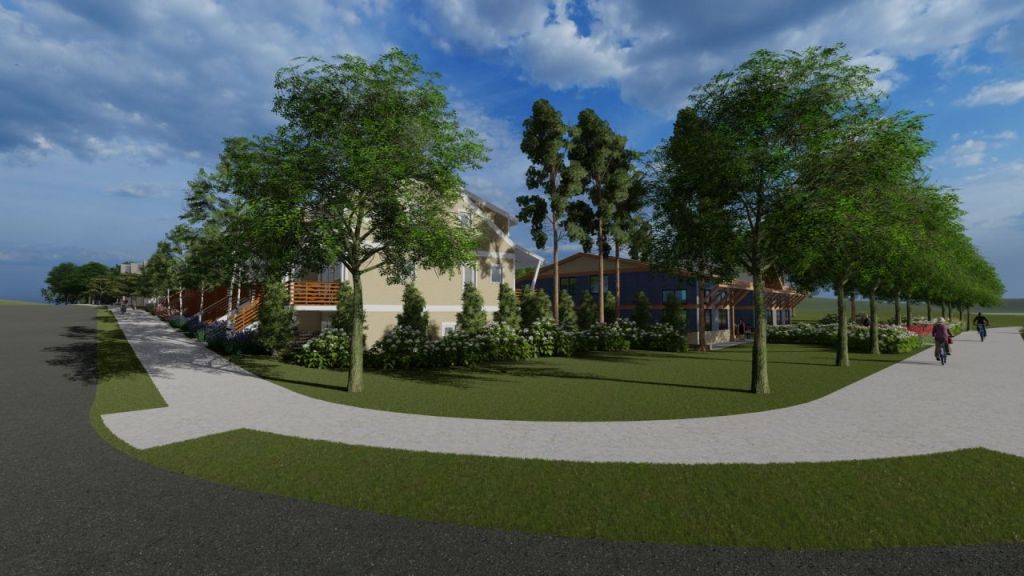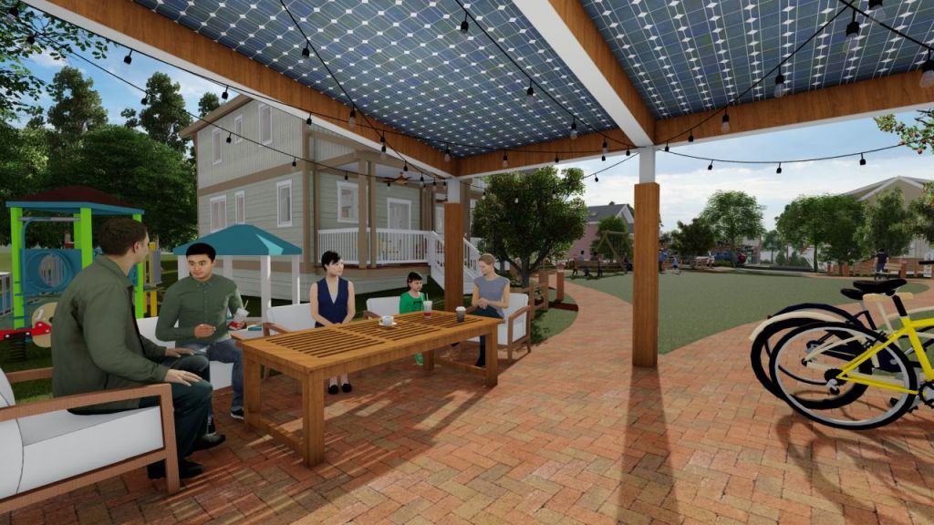 The pocket neighborhood features a dozen houses around a shared greenspace which is hoping to attract life with its shared pavilion for outdoor gatherings and kids playground. The parking is in the remote parking areas so that the greenspace stays free of automobiles.