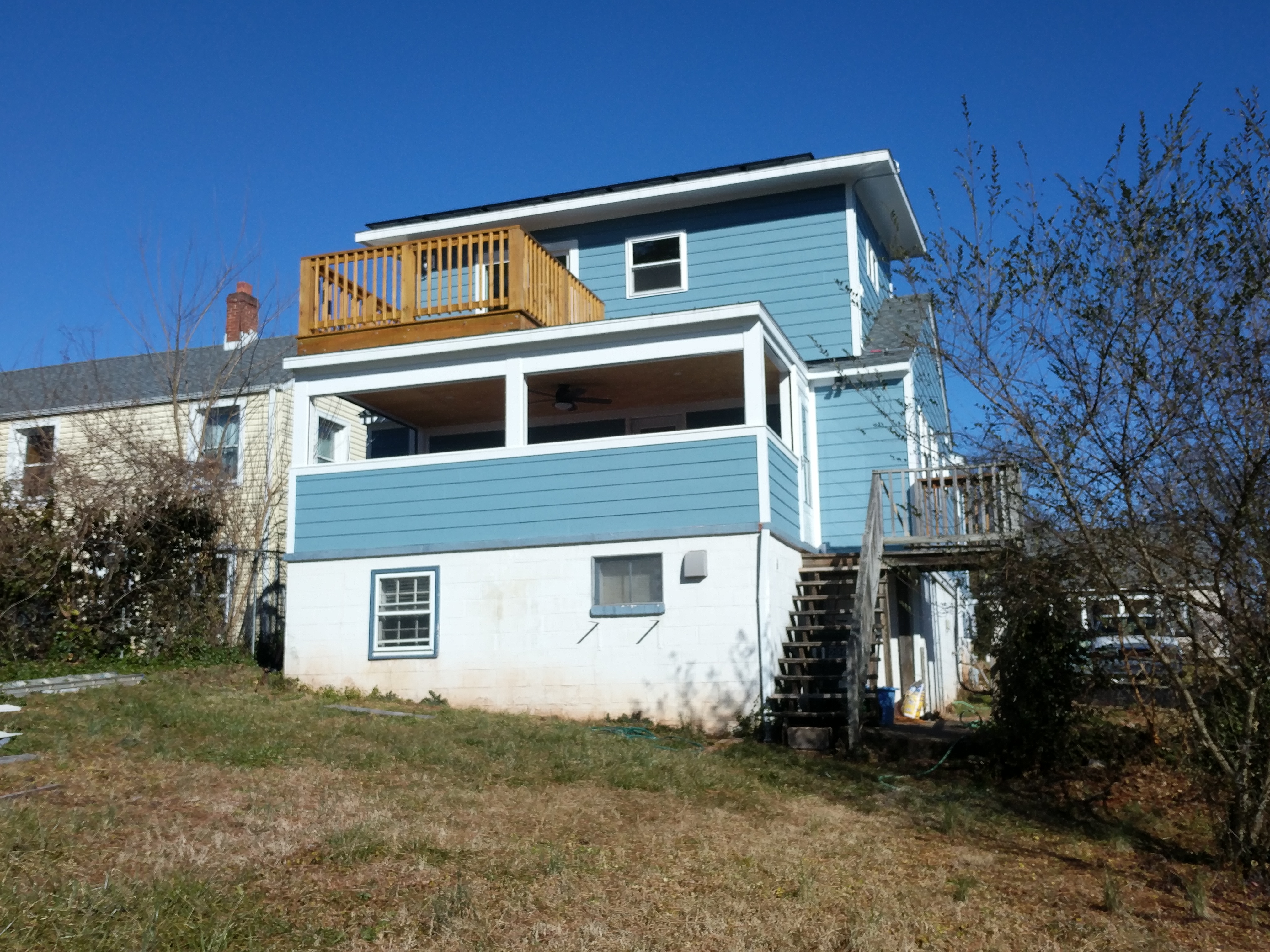 The windows, siding, roofing, and insulation are all new. Air sealing was also completed on the main floor and second floor but was not on the mostly unoccupied basement. An inverter driven heat pump was installed for heating and cooling so that no backup heating is needed. The two showers and the water heater are in a stack which makes the pipes very compact so that hot water gets to the showers quickly, saving water and energy. Even with many visitors and the original electric resistance water heater the solar panels have still generated more energy than the house has used in its first two years. After an incredible amount of work, the house looks fresh and new again and performs just as well.