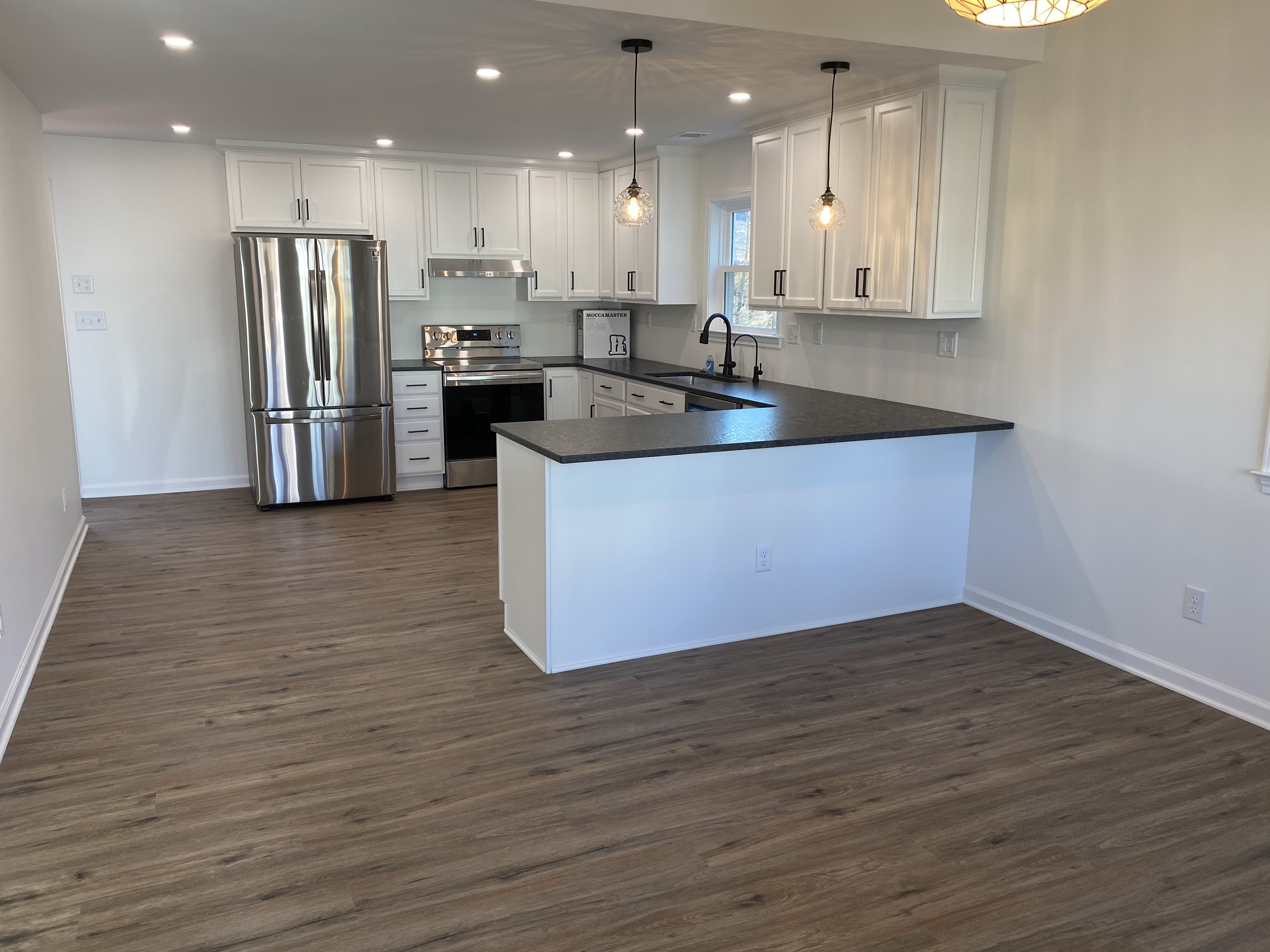 The existing roof lines were preserved so that the house would not only be less expensive, but also keep the feeling of the existing neighborhood. By keeping the original roof form in the front of the house, it enabled the living room to have a cathedral ceiling which gives the relatively small space a feeling of grandness. The relocated kitchen is open to the living room but separated by both the bar and the dramatic change in ceiling height.