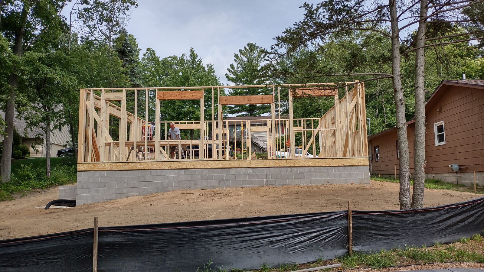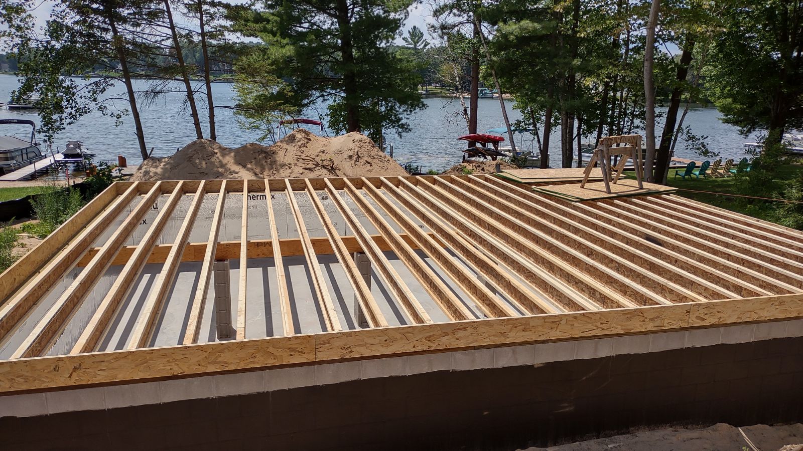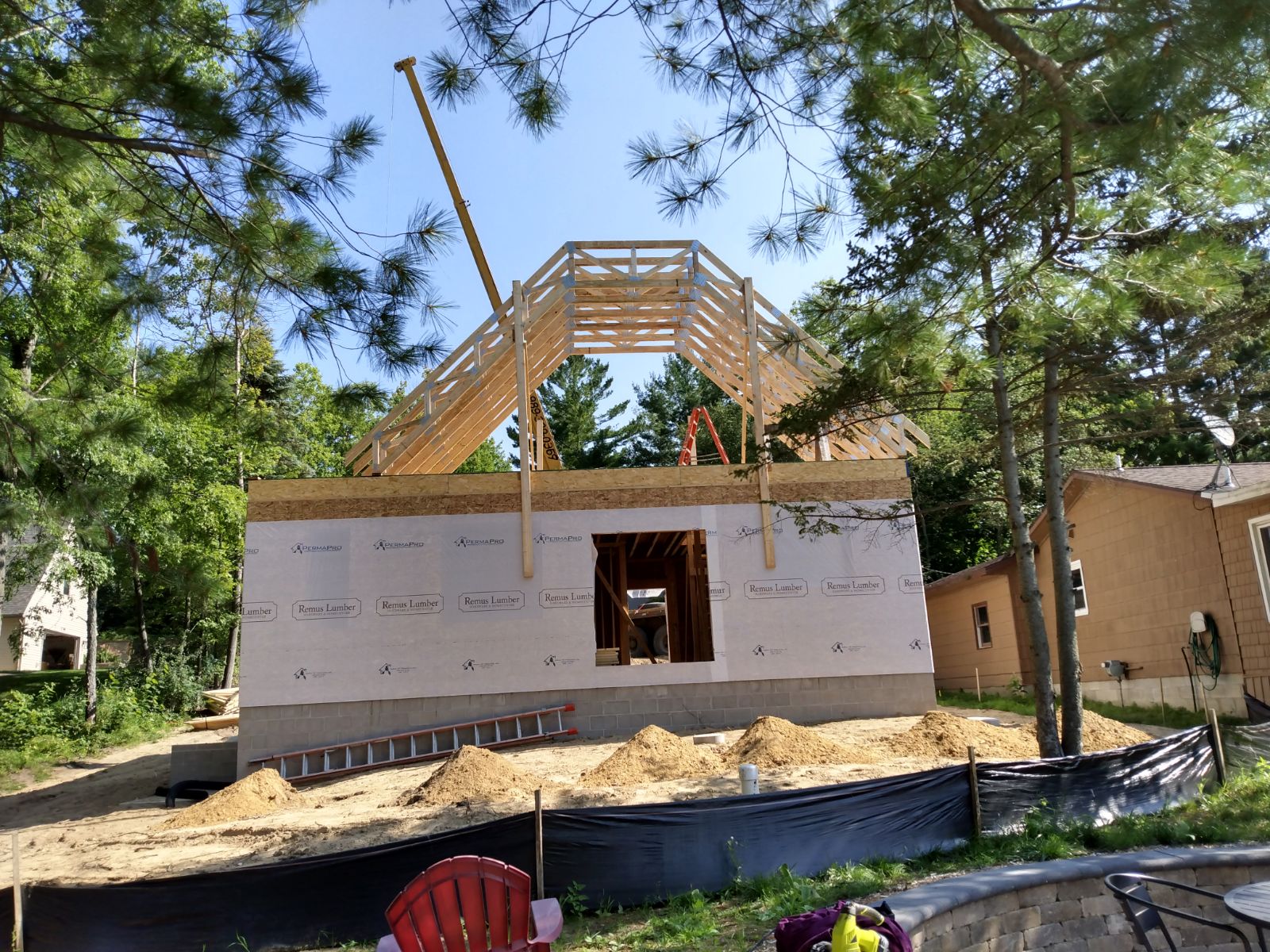 I had originally designed the house using attic style roof trusses, but the truss manufacturer came up with a clever parallel chord truss design so that we could have even nicer spaces upstairs without sacrificing the cost savings of truss based roof systems. The parallel chord style has the added benefit of being able to use blown-in cellulose for all of the roof insulation, while standard attic trusses usually need at least a little spray foam at the sloped ceiling areas to get up to code minimum insulation levels.